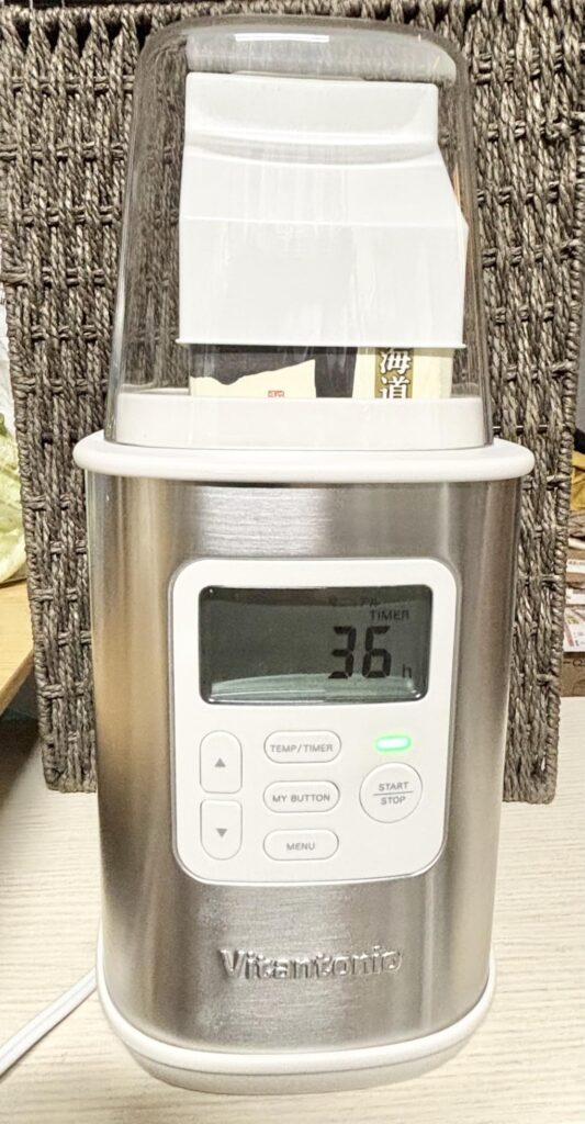 買ってきた1リットルの牛乳パックの口を開け、種菌を入れて、そのまま本体にIN。 洗い物が出ない。この「手間ゼロ」の設計こそが、ズボラな私でも毎日続けられる秘訣です。 付属の「牛乳パック用カバー」も気が利いていて、発酵中のパックの口をしっかり閉じてくれます。